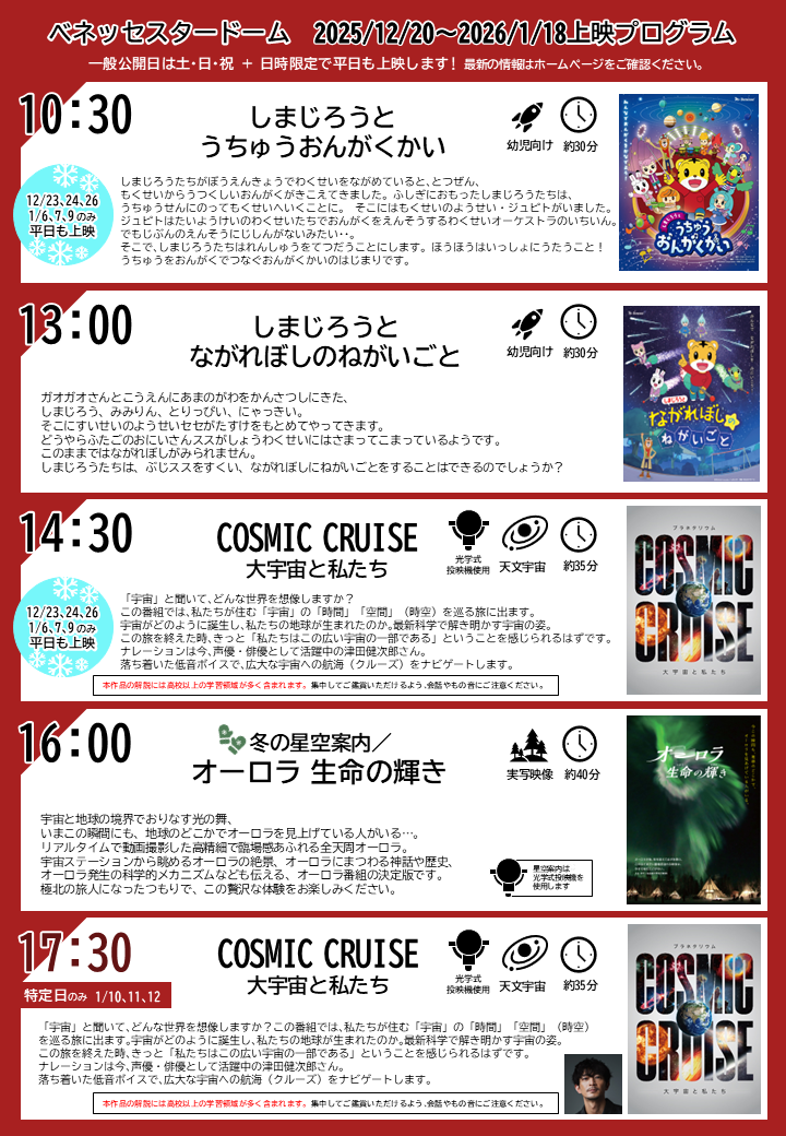 お知らせ 戻る 2025-12-14 12月20日(土)~上映番組変更のお知らせ 12/20(土)~1/18(日)の上映番組をご案内します。最新の情報は[上映番組]にてご確認ください ⇩ 詳細はこちらをクリック ⇩12月20日~1月18日上映プログラム12/29(月)~1月5日(月)は年末年始休館です、ご注意ください。 【番組スケジュール】◆ 14:30の回以降は、集中してご観賞いただけるよう、会話やもの音にご注意ください10:30 <約30分> しまじろうとうちゅうおんがくかい13:00 <約30分>しまじろうとながれぼしのねがいごと14:30 <約35分> COSMIC CRUISE ~大宇宙と私たち~16:00 <約40分> 冬の星空案内 + オーロラ 生命の輝き17:30 <約35分> COSMIC CRUISE ~大宇宙と私たち~17:30の回は <特定日>のみ1/10(土)、11(日)、12(月・祝) ▼▼▼ おすすめ番組のご案内 ▼▼▼ 「しまじろうとうちゅうおんがくかい」プラネタリウム版しまじろう作品の第4弾☆彡しまじろうたちが望遠鏡で惑星をながめていると、突然、木星から美しい音楽が聞こえてきました。 不思議に思ったしまじろうたちは、宇宙船に乗って木星へ行くことに。 そこには木星の妖精・ジュピトがいました。ジュピトは太陽系の惑星たちで音楽を演奏する惑星オーケストラの一員。でも自分の演奏に自信がないみたい・・。 そこで、しまじろうたちは練習を手伝うことにします。方法は一緒に歌うこと! 宇宙を音楽で繋ぐ音楽会のはじまりです。 「COSMIC CRUISE 大宇宙と私たち」◆ 本作品の解説には高校以上の学習領域が多く含まれます「宇宙」と聞いて、どんな世界を想像しますか?宇宙がどのように誕生し、私たちの地球が生まれたのか。46億年前に誕生した太陽と、そこから生まれた奇跡。最新科学で解き明かす宇宙の姿。この旅を終えた時、きっと「私たちはこの広い宇宙の一部である」ということを感じられるはずです。 ナレーションは今、声優・俳優として活躍中の津田健次郎さんが担当します。 戻る
