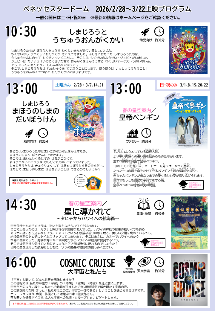 お知らせ 戻る 2026-02-18 2月28日(土)~上映番組変更のお知らせ 2/28(土)~3/22(日)の上映番組をご案内します。最新の情報は[上映番組]にてご確認ください⇩ 詳細はこちらをクリック ⇩2月28日~3月22日上映プログラム 【番組スケジュール】◆ 16:00の回は、集中してご観賞いただけるよう、会話やもの音にご注意ください10:30 <約30分> しまじろうとうちゅうおんがくかい13:00 <約30分>土曜のみ しまじろう まほうのしまのだいぼうけん <約30分>日祝のみ 春の星空案内+皇帝ペンギン14:30 <約40分> 春の星空案内 + 星に導かれて ~タヒチからハワイへの航海術~16:00 <約35分> COSMIC CRUISE ~大宇宙と私たち~ ▼▼▼ おすすめ番組のご案内 ▼▼▼ 「しまじろうとうちゅうおんがくかい」プラネタリウム版しまじろう作品の第4弾☆彡しまじろうたちが望遠鏡で惑星をながめていると、突然、木星から美しい音楽が聞こえてきました。 不思議に思ったしまじろうたちは、宇宙船に乗って木星へ行くことに。 そこには木星の妖精・ジュピトがいました。ジュピトは太陽系の惑星たちで音楽を演奏する惑星オーケストラの一員。でも自分の演奏に自信がないみたい・・。 そこで、しまじろうたちは練習を手伝うことにします。方法は一緒に歌うこと! 宇宙を音楽で繋ぐ音楽会のはじまりです。 「COSMIC CRUISE 大宇宙と私たち」◆ 本作品の解説には高校以上の学習領域が多く含まれます「宇宙」と聞いて、どんな世界を想像しますか?宇宙がどのように誕生し、私たちの地球が生まれたのか。46億年前に誕生した太陽と、そこから生まれた奇跡。最新科学で解き明かす宇宙の姿。この旅を終えた時、きっと「私たちはこの広い宇宙の一部である」ということを感じられるはずです。 ナレーションは今、声優・俳優として活躍中の津田健次郎さんが担当します。 戻る